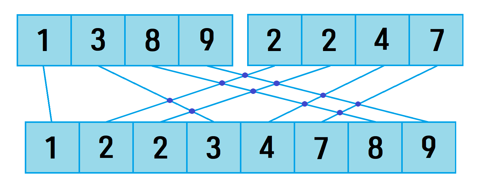 왼쪽 배열과 오른쪽 배열에 원소가 각각 1개 이상 남아있는 동안 반복문을 돌리며 왼쪽 배열의 가장 작은 원소와 오른쪽 배열의 가장 작은 원소를 비교하여 더 작은 원소를 임시 배열의 맨 뒤에 추가하는 작업을 반복한다. 그 후 어느 한 쪽 배열의 원소가 모두 소진된 후엔 남은 원소들을 임시 배열의 뒤에 그대로 추가해준다. 이 때, 우리는 이 문제의 답을 구하기 위해 정렬 전후에서 원소를 이은 선들의 교차점의 수를 구할 것이다.